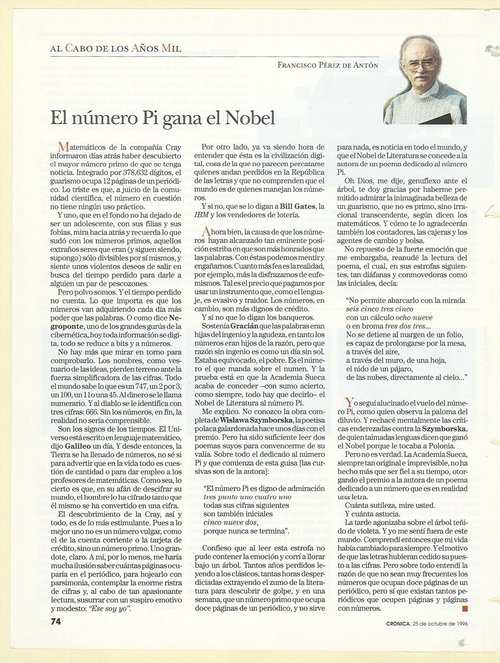 | Octubre 1996 |     | El número Pi gana el Nobel